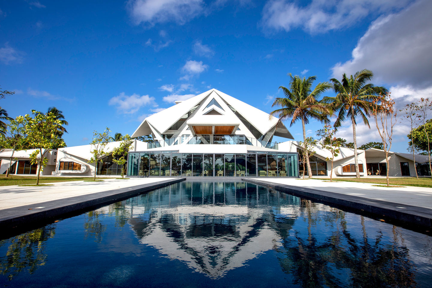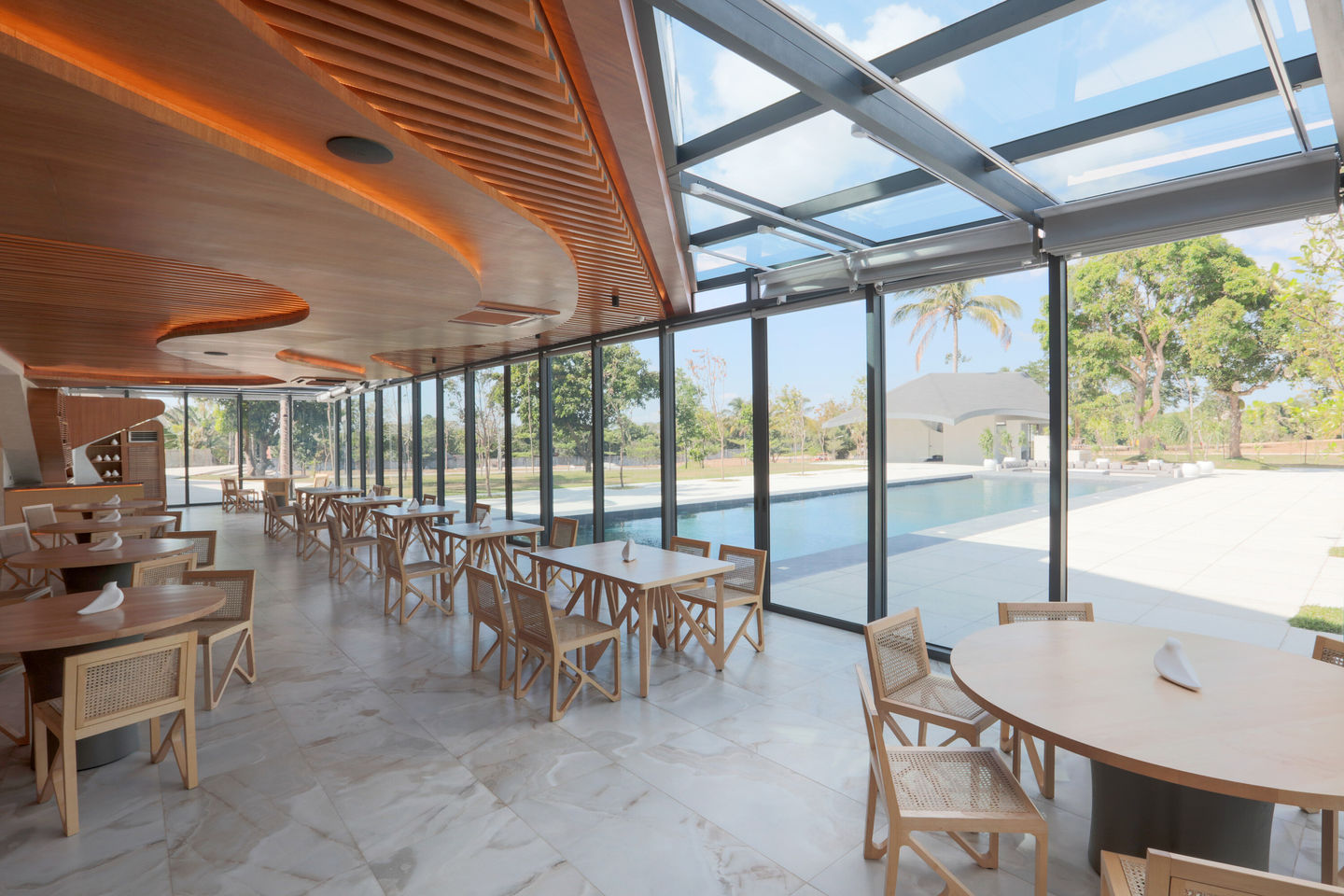 As you approach, the architecture appears to integrate with the terrain, its cavernous spaces inviting exploration and contemplation. In the second floor, you are offered with an expansive horizontal view of the farmland. On the lofted third floor, a cantilevered lounge juts out with a triangulated framing of the sky, the pavilion and the chicken coop. As you ascend to the fourth floor, intimacy embraces you, with private spaces framing both farmland and sunsets. The view evolves with each level, culminating in different perspective of the ever-changing sky. At sunset, the building transforms, harmoniously merging with nature, especially by the sunken bonfire, creating a magical experience that captivates the soul. Nearby, a shimmering pool reflects the illuminated facade of the building, casting a captivating glow that mesmerizes the senses like a lantern at night. Striking architectural elements, like the gravity-defying illusion of the folding concrete deep cantilevers, serving not only as a design statement but also as effective sun shades, enhancing comfort. Private villas encircle the landscape, framing serene nature views comparable to still-life paintings scenarios. In the private dining spaces, gastronomic journey is elevated by the fusion of bold architecture and fertile farmland.