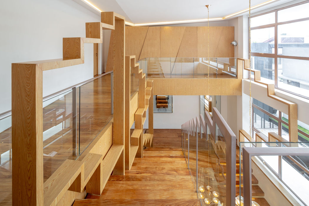 An owner being an avid music connoisseur and enthusiast – we created an open-plan and set back the pond in the ground floor to create a feeling that is somewhat an island – the coy pond enters the house to blur the indoor and outdoor boundary. As you enter the main door you are already invited to this bohemian rhapsody fantasy through this door handle inspired by a famous Fender guitar, a complex rhythmic composition of alcove ceiling lighting is predominant in the house that gives a feeling of musicality in three levels – a kind of interface of allegro movement and to create the separation of spaces but without the walls. The allegro inspired zig zag movements that goes inside and outside and like floating into space has this brisk, humor and lively qualities. The layering of different materials of teak wood, rose champagne metal and oak veneers create this symphony of floating lines and an amalgamation of energies, layering, framing and textures that creates this spatial scenery for family life beating its inner chords and corrugating the boundaries of indoor and outdoor, art and architecture, body and movement, space and time. A staircase is normally just a transitional space from A to B but here it is habitable, dynamic, engaging and the most energetic and healthy space. The house feels like an orchestrated series of spaces with areas of silence (adagio), expansion (accelerando), and tempo jolt surprises of these fluid lines blurring the boundaries of wall, floor and ceiling. We created a sensual ethos in its architecture merging body, nature, movement and musicality which uplifts the quality of life and happiness of the domestic life.